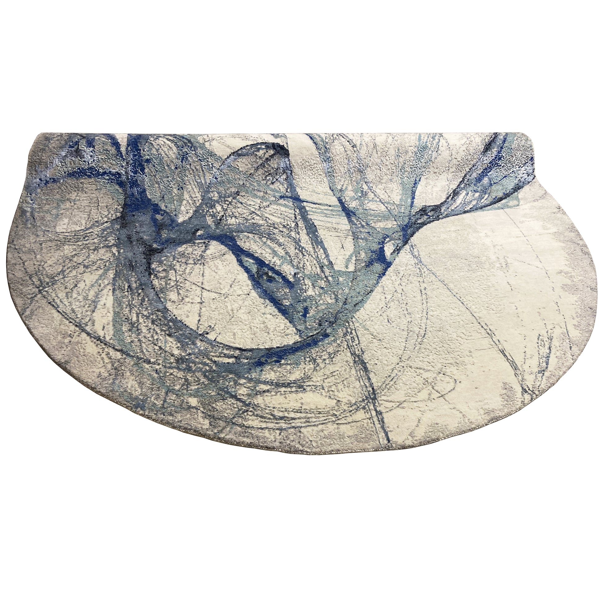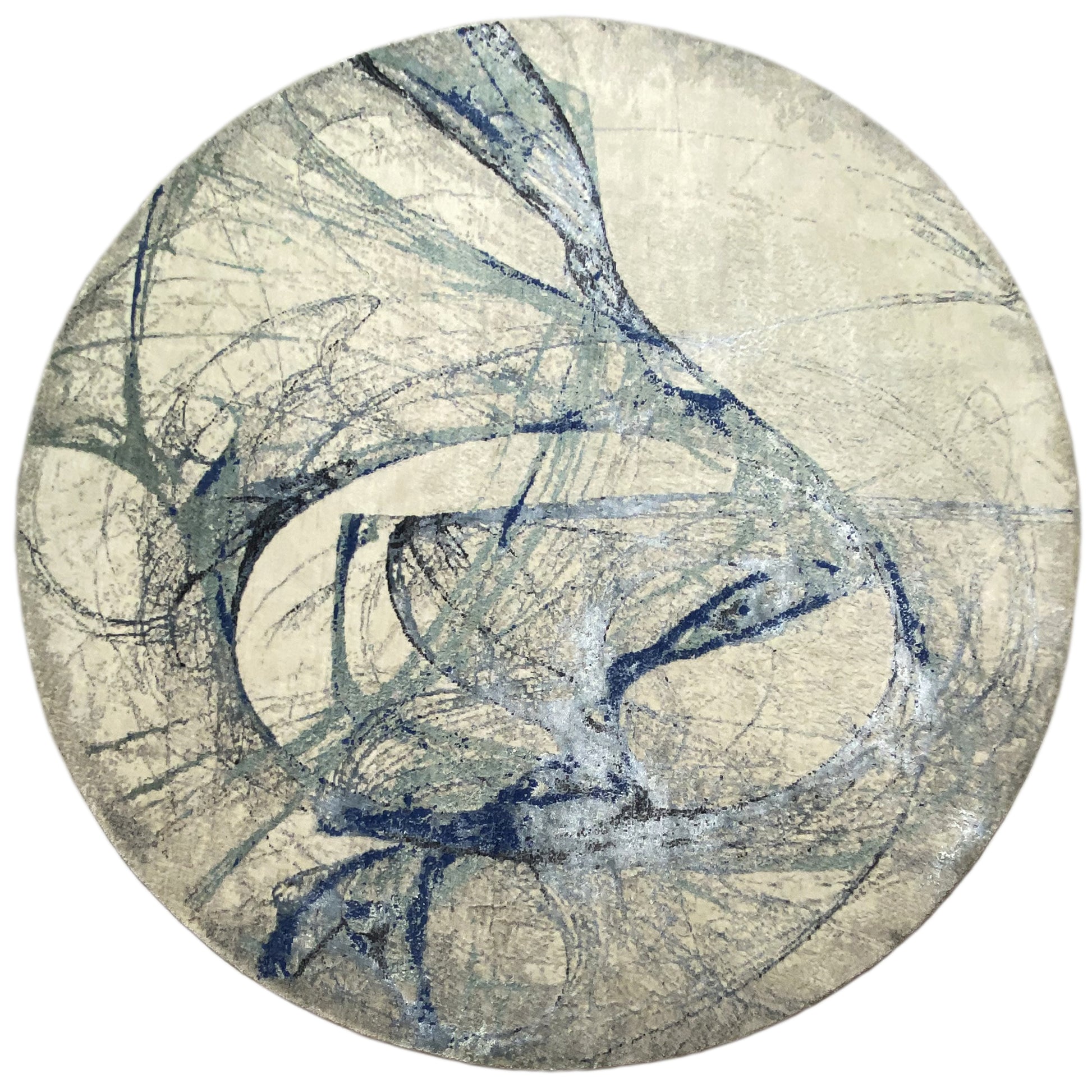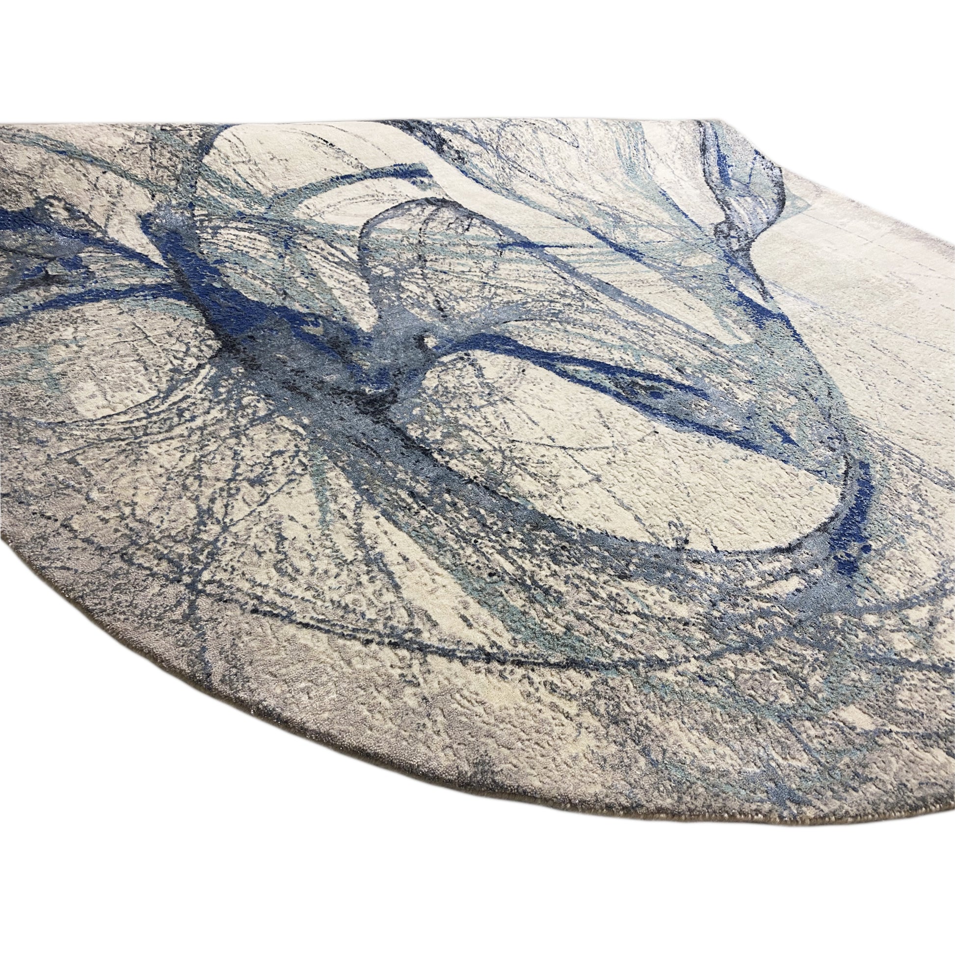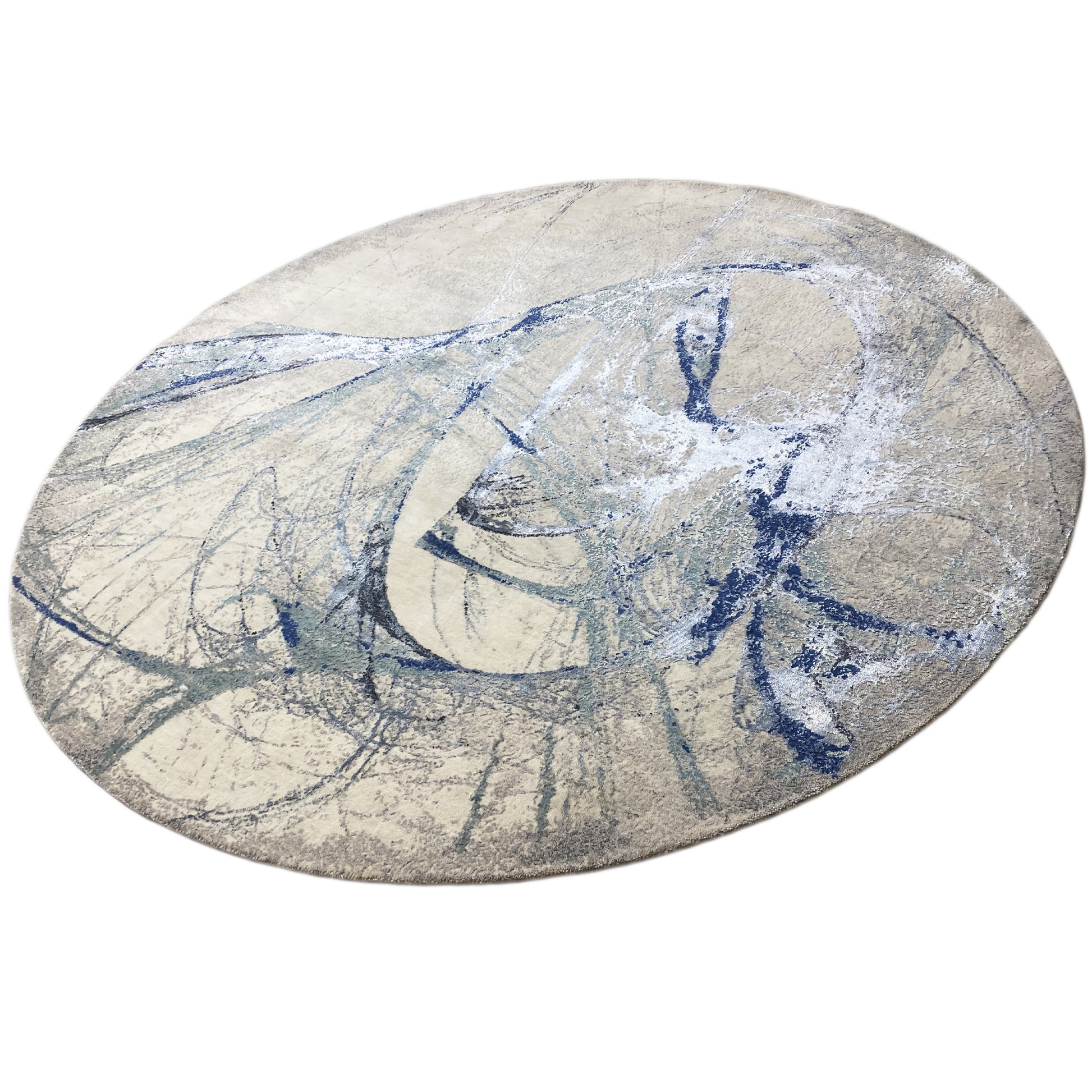 Deze unieke, ronde designervloerkleed met een diameter van 248 cm is gemaakt van handgesponnen, plantaardig geverfde wol. Op de subtiele beige achtergrond ontvouwt zich een dynamisch, abstract patroon van vloeiende blauwe en grijze lijnen, dat doet denken aan een kunstwerk. Perfect voor moderne en artistieke interieurstijlen, doorbreekt de organische vorm de lineariteit van de ruimte en zorgt het voor een elegante, eigentijdse blikvanger.