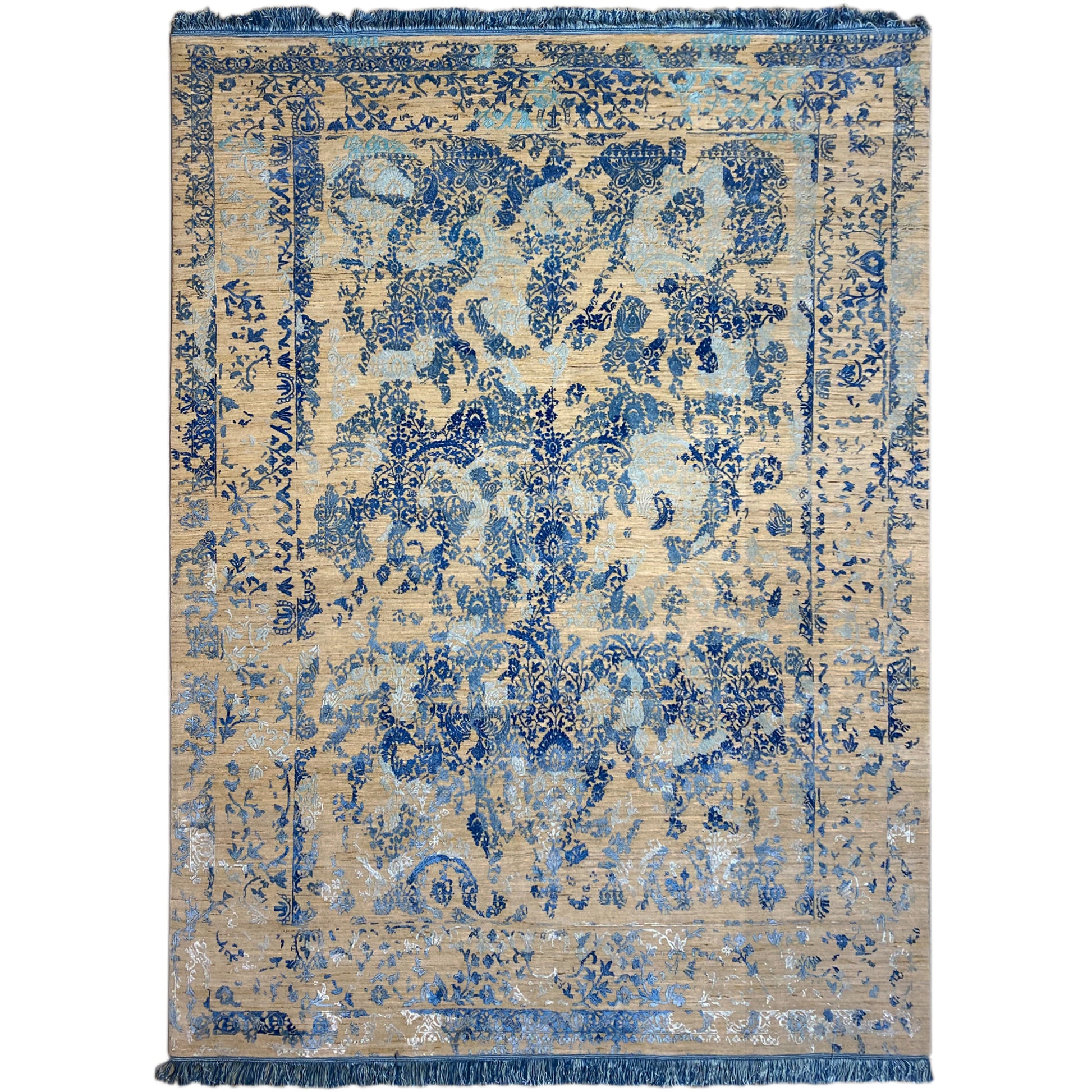 Geef uw huis stijl met dit handgeknoopte designertapijt in elegante blauwtinten, maat 308x255 cm. Gemaakt van een hoogwaardige mix van wol en viscose, toont het een klassiek bloemmotief – perfect voor klassieke en moderne woonstijlen. Ideaal voor woonkamers of lounges, brengt dit tapijt structuur, warmte en elegantie in elke ruimte. De zachte pool zorgt voor aangenaam loopcomfort en het gedetailleerde uiterlijk trekt alle aandacht.