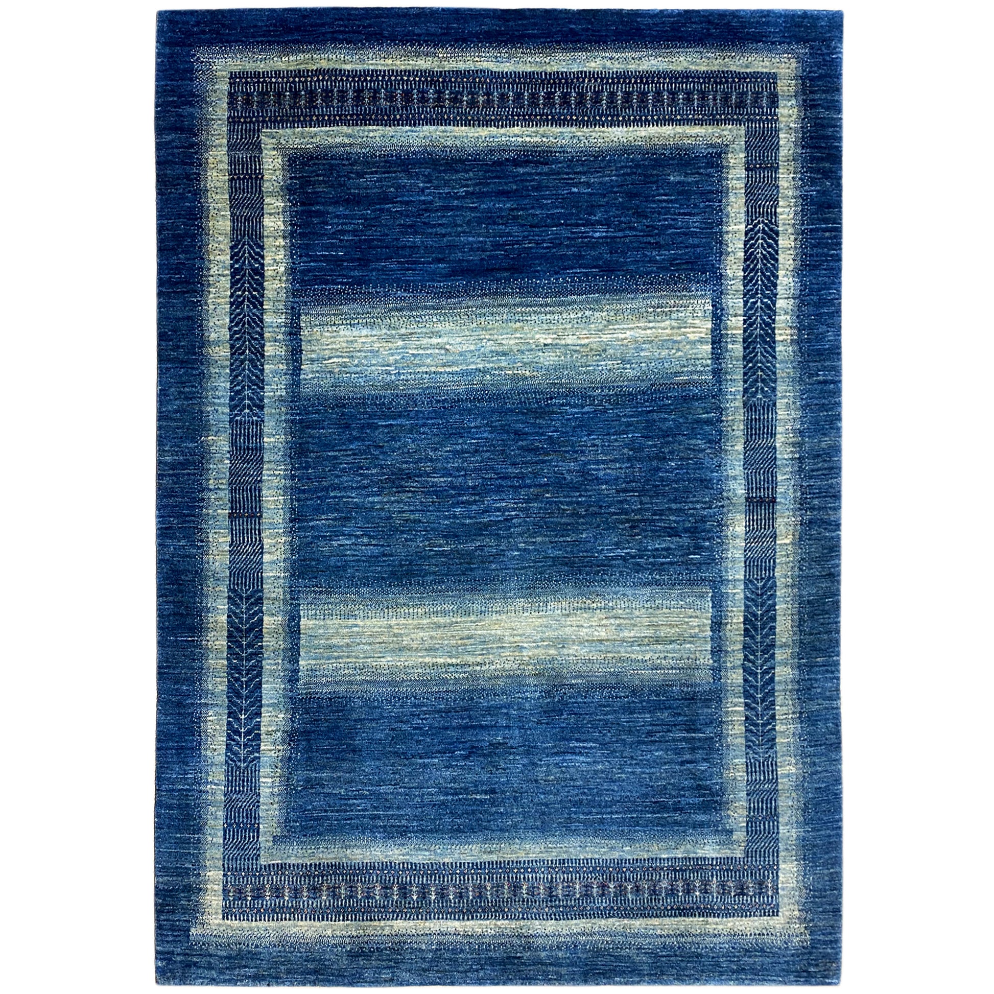 Deze fascinerende Luri Gabbeh-tapijt, met de hand geknoopt van handgesponnen, plantaardig geverfde wol, presenteert zich in diepe blauwtinten met een opvallend rechthoekig patroon en subtiele strepen. Met een afmeting van 210x160cm is het een ideale aanvulling voor diverse interieurstijlen, van maritiem tot modern, en creëert het een rustige en stijlvolle sfeer. Het authentieke vakmanschap en de natuurlijke materialen maken dit tapijt tot een duurzaam en uniek kunstwerk dat comfort en esthetische diepte in uw huis brengt.