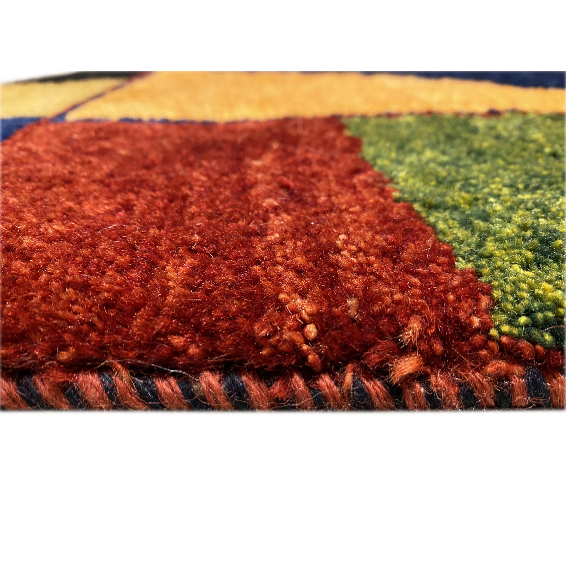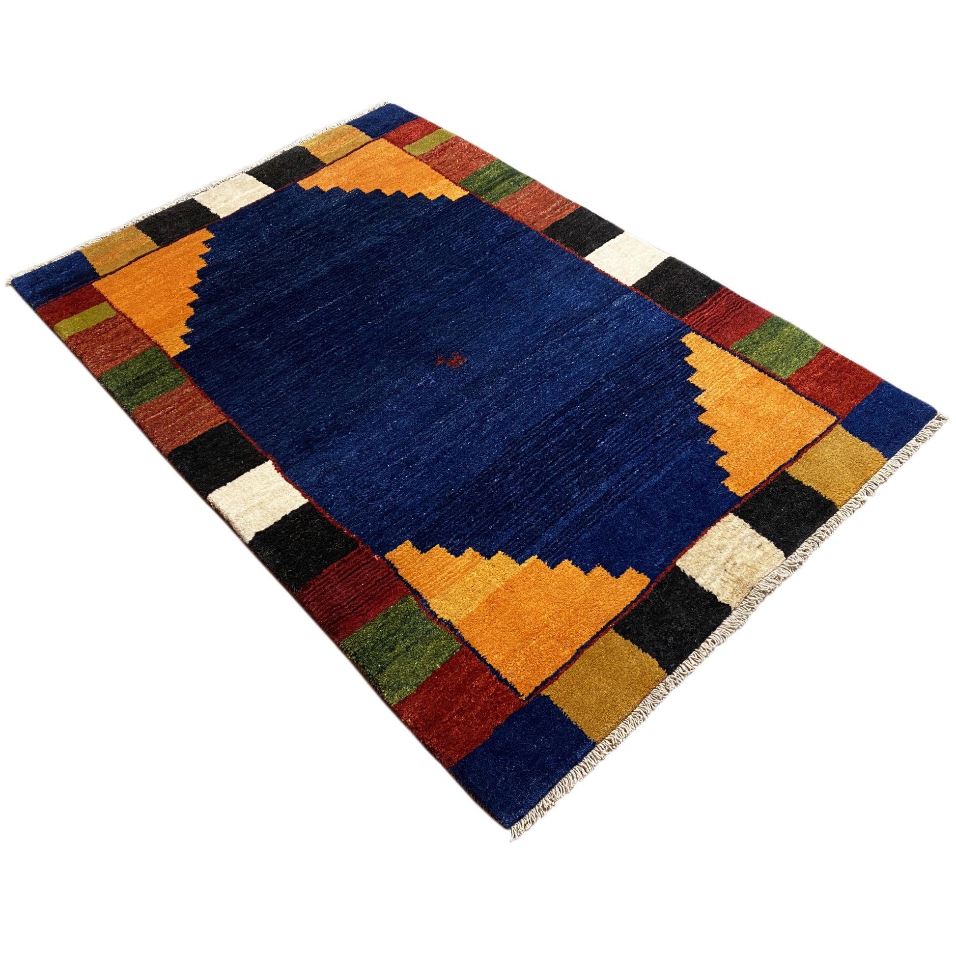Deze met de hand geknoopte Gabbeh-tapijt van 164x114cm, gemaakt van met de hand gesponnen, plantaardig geverfde wol, brengt een natuurlijke, rustieke toets in uw huis. Het minimalistische ontwerp met een centraal ruitpatroon en levendige kleuren maakt het een veelzijdig element voor moderne en traditionele interieurstijlen, dat warmte en karakter toevoegt.