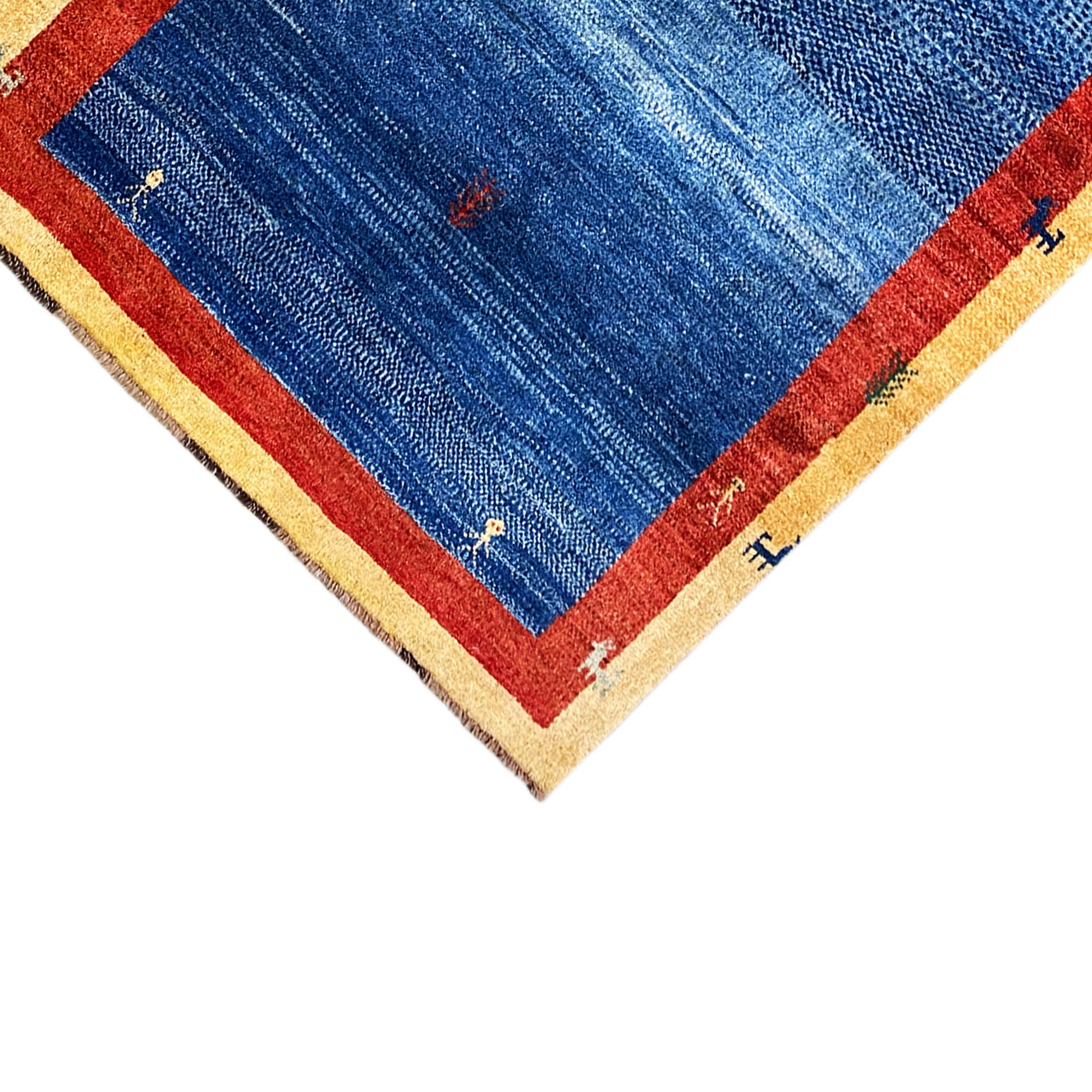 Deze expressieve, met de hand geknoopte Gabbeh-tapijt van handgesponnen, plantaardig geverfde wol toont een diepblauwe kern, omgeven door een opvallende rode binnenrand en een brede gele buitenrand met gestileerde figuren. Met zijn afmetingen van 192x120 cm is het een veelzijdig statementstuk dat elke ruimte, van traditioneel tot modern, een levendige en toch aardse sfeer geeft. De combinatie van traditioneel vakmanschap, de heldere kleuren en het unieke figuratieve patroon maakt dit tapijt tot een bijzonder blikvanger die zowel visuele interesse wekt als gezelligheid brengt.
