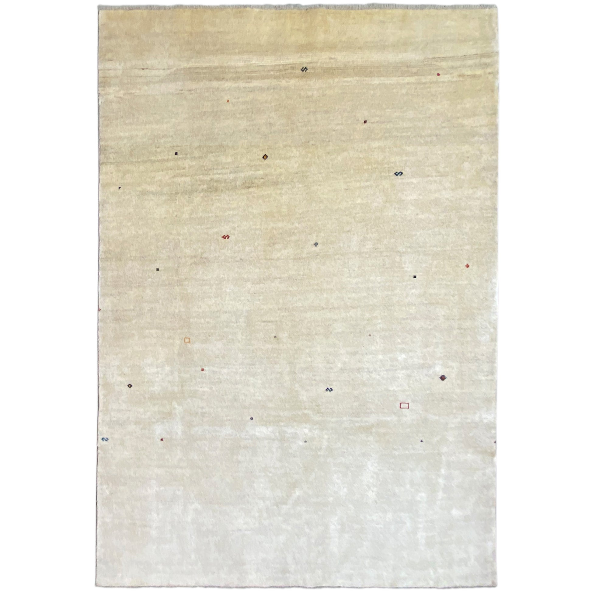Deze subtiele, met de hand geknoopte Gabbeh-tapijt van handgesponnen, plantaardig geverfde wol valt op door zijn rustige beige basiskleur, die is voorzien van subtiele, willekeurig verspreide kleurvlekken. Met zijn royale afmetingen van 284x197 cm is het een uitstekende keuze voor ruimtes die een lichte en open sfeer willen behouden, en past het naadloos in minimalistische, Scandinavische of moderne interieurstijlen. Het eenvoudige, maar toch interessante patroon geeft het tapijt een ingetogen elegantie, terwijl de natuurlijke wol zorgt voor een aangename textuur en duurzaamheid.