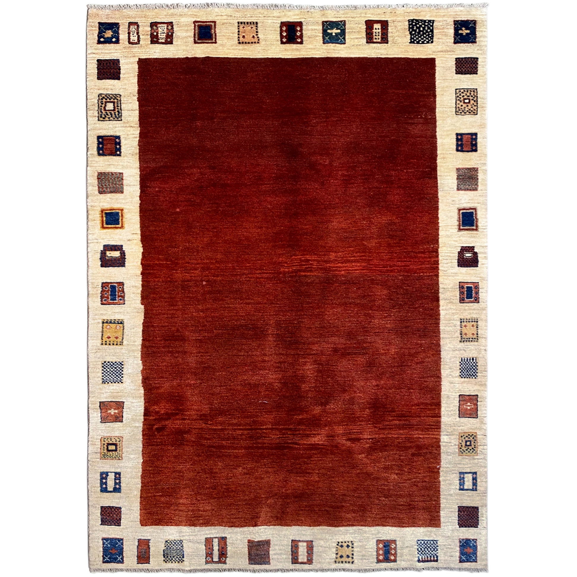 Deze indrukwekkende, met de hand geknoopte Gabbeh-tapijt van handgesponnen, plantaardig geverfde wol valt op door zijn warme rode kern, omgeven door een brede beige rand met kleurrijke, geometrische motieven. Met zijn royale afmetingen van 287x197 cm is het een centraal blikvanger die elke woonruimte een gezellige en tegelijk artistieke sfeer geeft. De harmonieuze combinatie van de krachtige hoofdkleur en de speelse details van de rand maakt dit tapijt tot een veelzijdig element dat zowel in traditionele als moderne interieurstijlen past en tegelijkertijd een verhaal van vakmanschap vertelt.