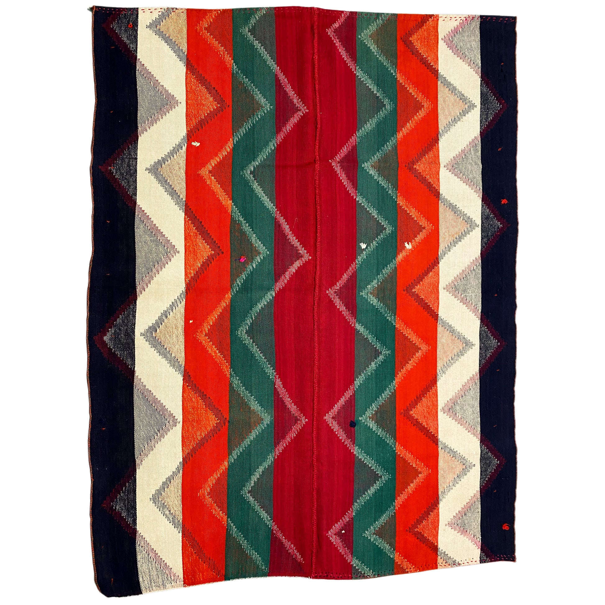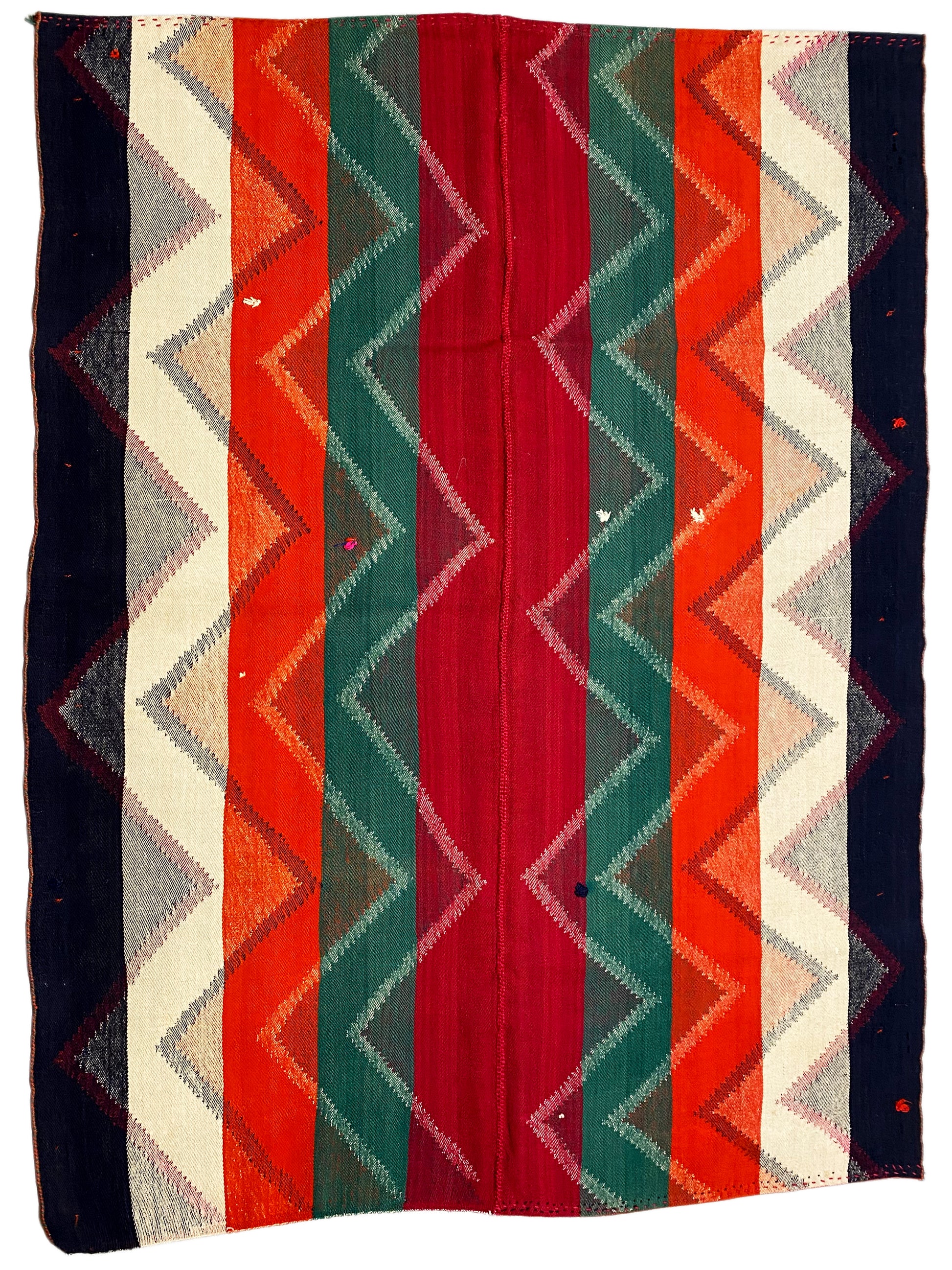 Dieser handgewebte Jajim Teppich aus handgesponnener Wolle besticht durch sein ausdrucksstarkes geometrisches Zigzag-Streifenmuster in intensiven Rot-, Grün-, Orange-, Blau- und Cremetönen, das ideal zum lebendigen Boho-Dekor-Stil passt; die großzügige Größe von 222x166 cm macht ihn perfekt für Wohn-, Schlaf- und Essbereiche, während seine robuste Wollqualität, traditionelle Webkunst und kräftige Farbgebung jedem Raum Wärme, Charakter und authentische Handwerksästhetik verleihen.