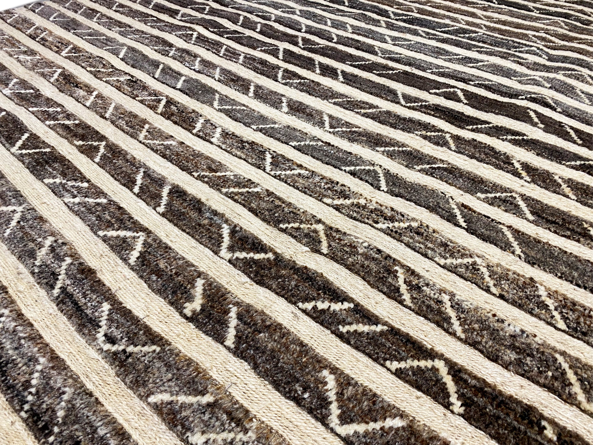 Dit met de hand geweven Kelim Gabbeh tapijt van 100% handgesponnen wol valt op door zijn warme bruine kleurenpalet en fijne geometrische strepen, die elke ruimte een moderne en toch gezellige sfeer geven. Met een afmeting van 193x150 cm is het ideaal voor woonkamers of eetgedeeltes en past het perfect bij moderne, boho en rustieke interieurstijlen. Het karakteristieke streeppatroon met subtiele tribal-elementen zorgt voor visuele diepte, terwijl de hoogwaardige afwerking garant staat voor duurzaamheid, slijtvastheid en een aangenaam zacht loopgevoel – perfect voor stijlvol en comfortabel wonen.