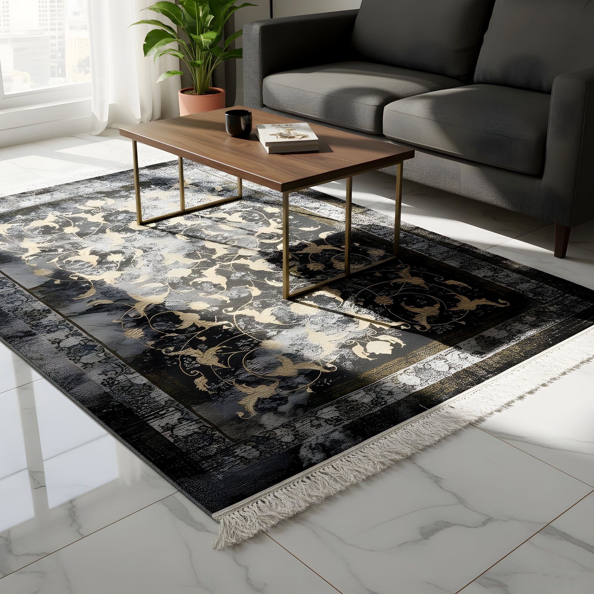 Geef uw huis een vleugje elegantie met ons geweven tapijt "Kenza". Met zijn stijlvolle vintage ontwerp en moderne accenten in goud en zwart, past dit tapijt harmonieus in elk interieur. Gemaakt van 100% polypropyleen, is het niet alleen onderhoudsvriendelijk en duurzaam, maar ook ideaal voor drukbezochte ruimtes. Het bloemmotief in chique goudtinten op een donkere achtergrond geeft het tapijt van 160x230 cm een luxueuze uitstraling. Ervaar comfort en stijl, perfect afgestemd op uw woonkamer of slaapkamer.