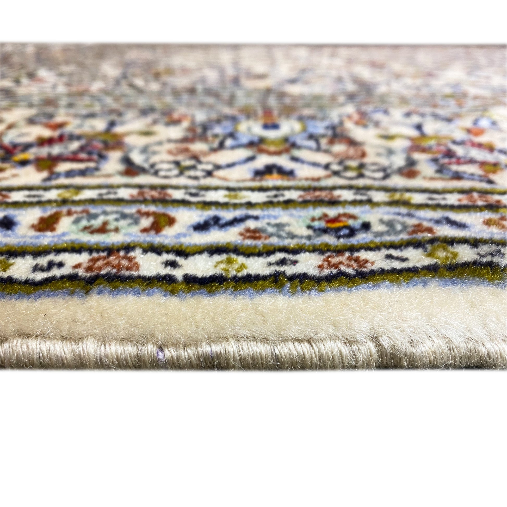 Dit met de hand geknoopte Keshan-tapijt, gemaakt van een luxueuze wol/viscose-mix, heeft een afmeting van 294x192 cm. Het toont een klassiek medaillonpatroon en is perfect om traditionele en overgangsstijlen een elegante touch te geven. De zachte beigetinten en de kunstzinnige bloemmotieven creëren een verfijnde blikvanger en brengen tegelijkertijd warmte en tijdloze schoonheid in uw woon- of eetkamer.