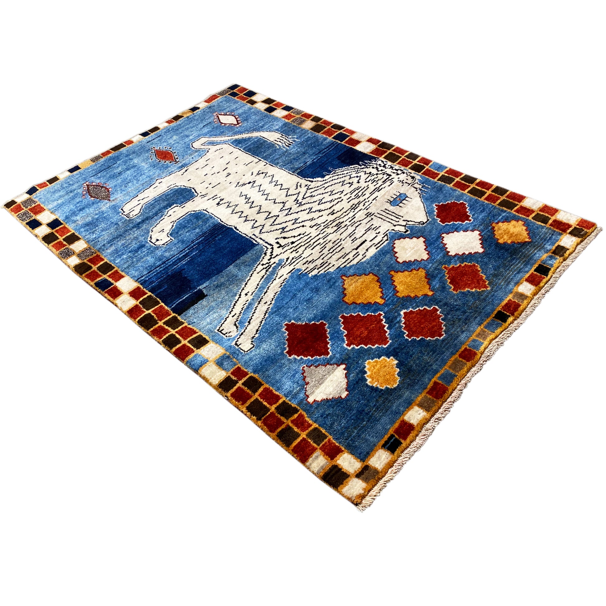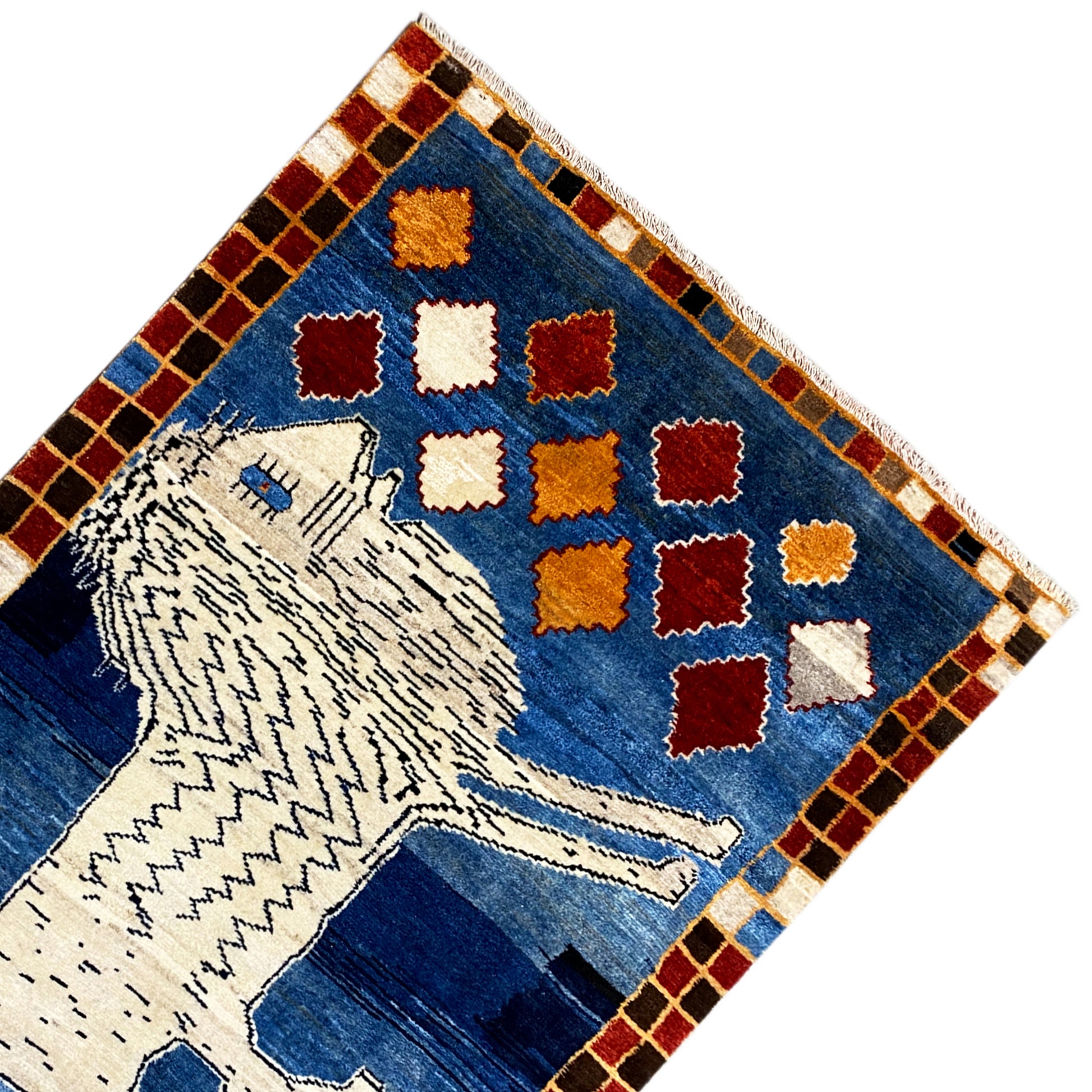 Deze unieke Leeuw-Gabbeh-tapijt, met de hand geknoopt van handgesponnen, plantaardig geverfde wol, valt op door zijn traditionele decoratiestijl en een opvallend leeuwenmotief. Met een afmeting van 179x124cm is dit blauwe tapijt een krachtig statementstuk dat elke ruimte karakter geeft en duurzaamheid garandeert.