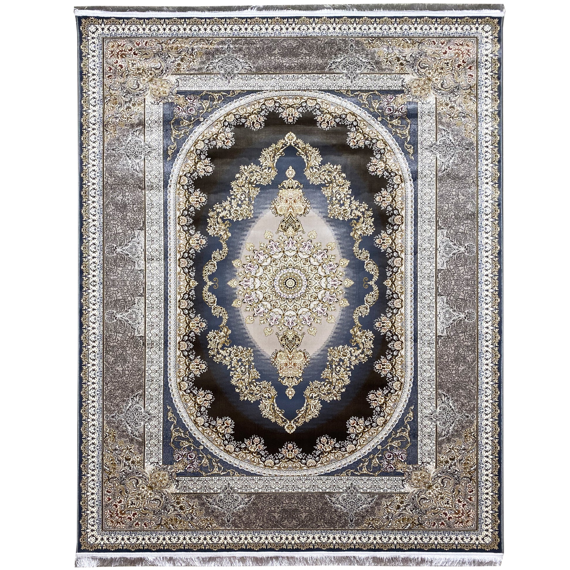 Geef uw huis een weelderige elegantie met dit prachtige klassieke tapijt. Het opvallende ovale medaillonpatroon en de kunstzinnige bloemmotieven in metallic marineblauw en crèmekleuren creëren een verfijnde uitstraling. Gemaakt van 100% hittebehandeld acryl, is dit zachte en duurzame tapijt ideaal voor drukbezochte ruimtes en brengt het luxe in elke kamer. De royale afmeting van 170x240cm maakt het het ideale statementstuk voor uw woon- of eetkamer.
