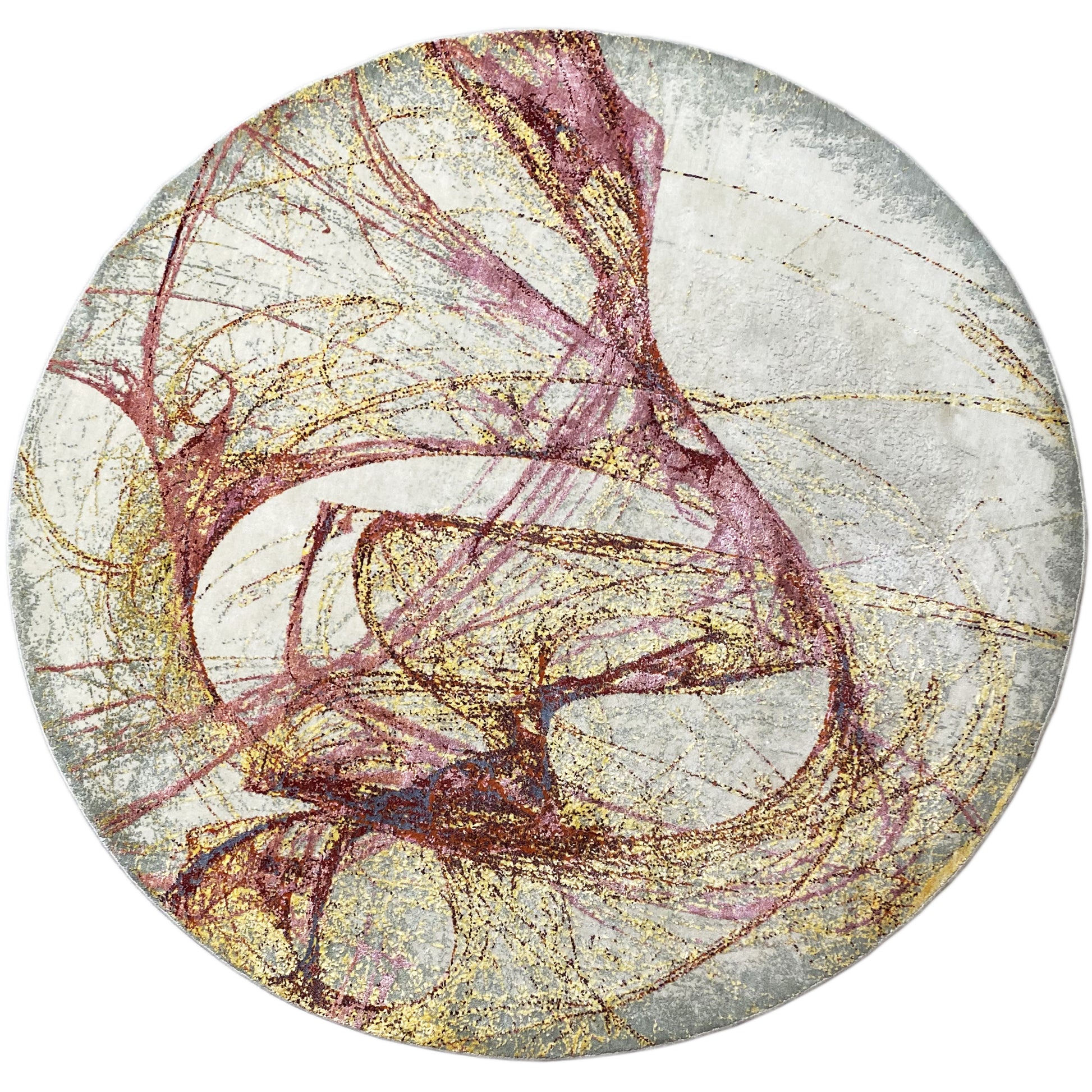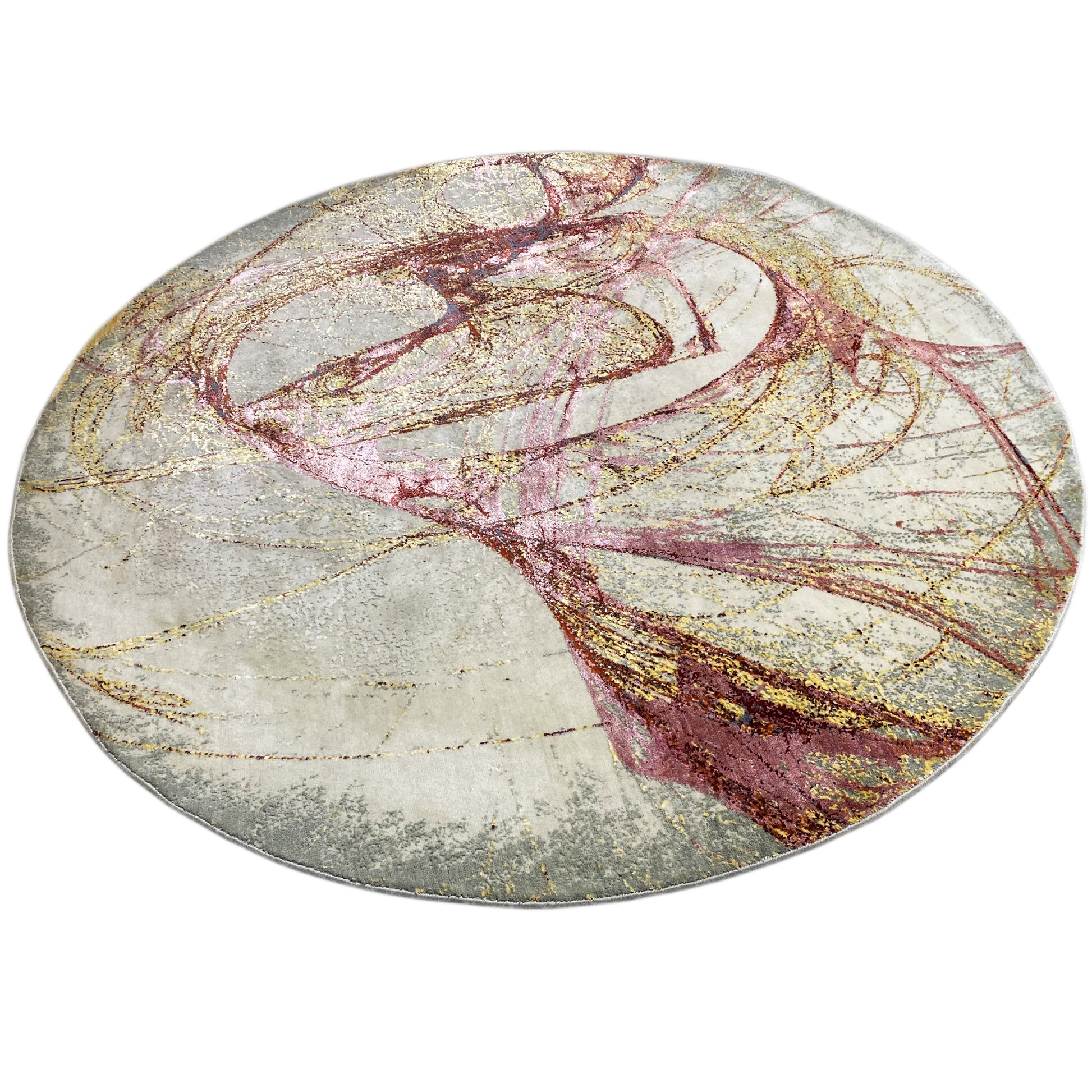 Dit met de hand geknoopte, ronde tapijt van een mix van handgesponnen wol en viscose is een modern kunstwerk voor uw vloer. Het abstracte patroon in rosé en goud op een beige achtergrond geeft uw ruimte een luxe en tegelijk speelse toets. Met een afmeting van 202x202 cm is het een stijlvolle aanvulling voor woon- of slaapkamer en creëert het een warme, uitnodigende sfeer.