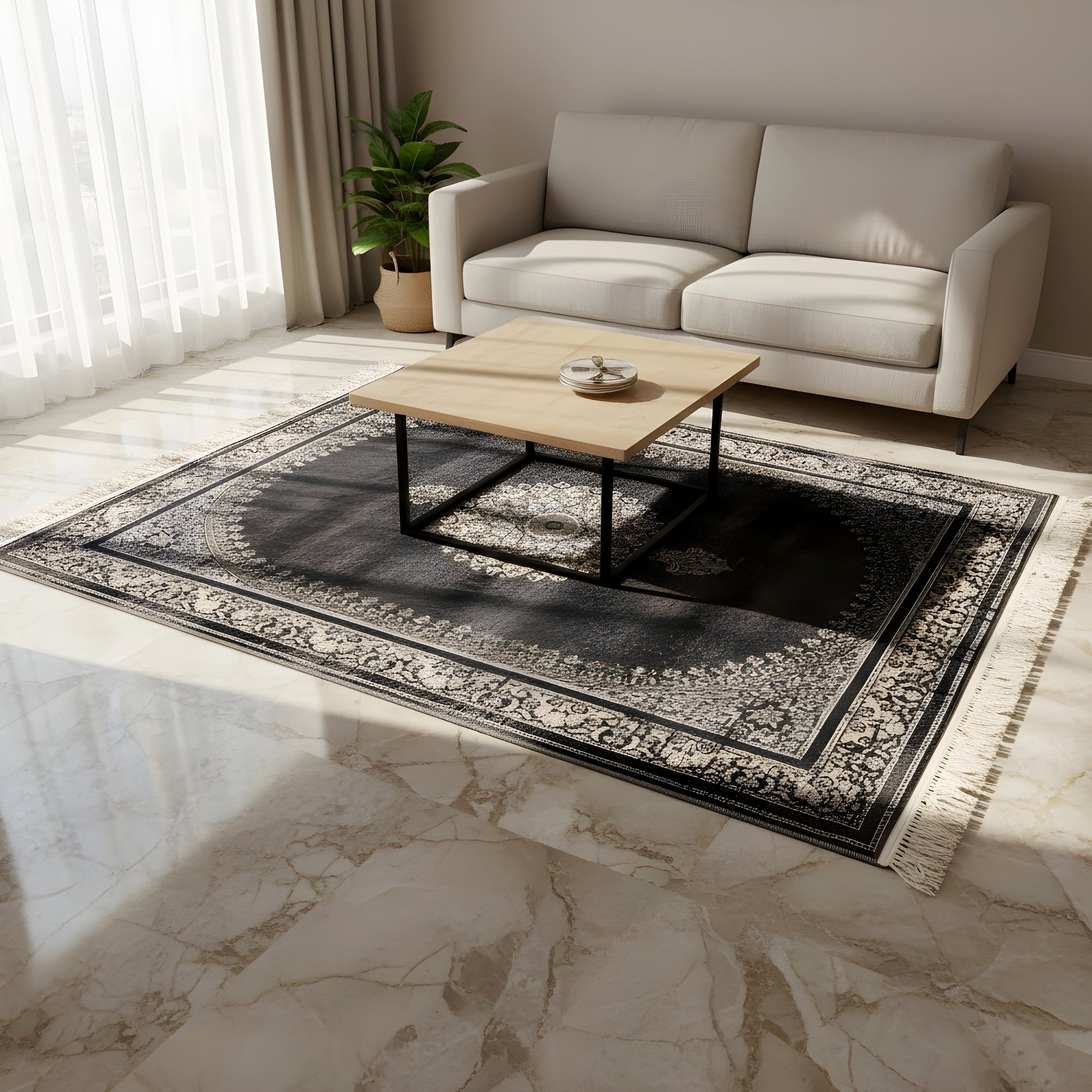 Machinaal geweven tapijt van polypropyleen in klassiek oosters decor met gecentreerd medaillon, donker ovaal veld en bloemrijke boord in zwart, grijs, beige en wit. De maat 160x230 cm biedt een zachte aanraking, hoge slijtvastheid en eenvoudige verzorging voor woonkamer, eetkamer en slaapkamer. Het tijdloze patroon zet elegante accenten en vult zowel traditionele als moderne interieurs aan, ideaal voor stijlvolle woonruimtes met duurzame comfort.