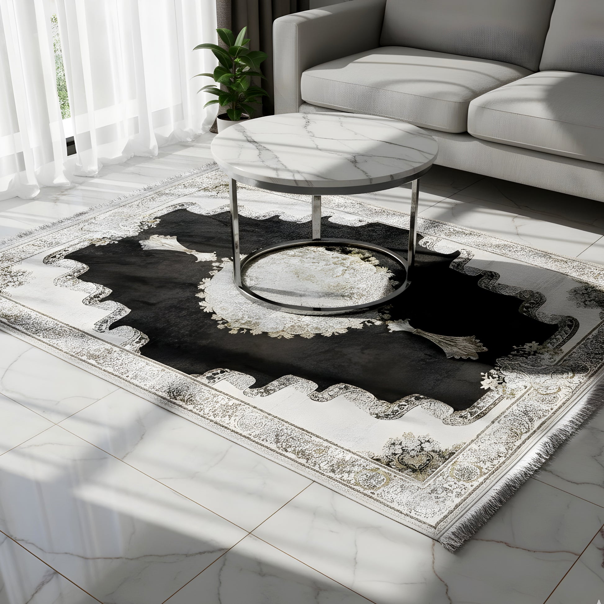 Geef uw huis een vleugje dramatische elegantie met dit prachtige klassieke tapijt. Het opvallende, donkere binnenveld in rookgrijs vormt een indrukwekkend contrast met de lichte, crèmekleurige rand en het gedetailleerde medaillon in het midden. Het unieke randpatroon zorgt voor een extra luxueuze toets. Gemaakt van 100% hittebehandeld acryl, is dit zachte en duurzame tapijt perfect voor drukbezochte ruimtes, omdat het luxe stijl combineert met moderne veerkracht. De royale afmeting van 170x240cm is ideaal om uw woon- of slaapkamer een elegante blikvanger te geven.