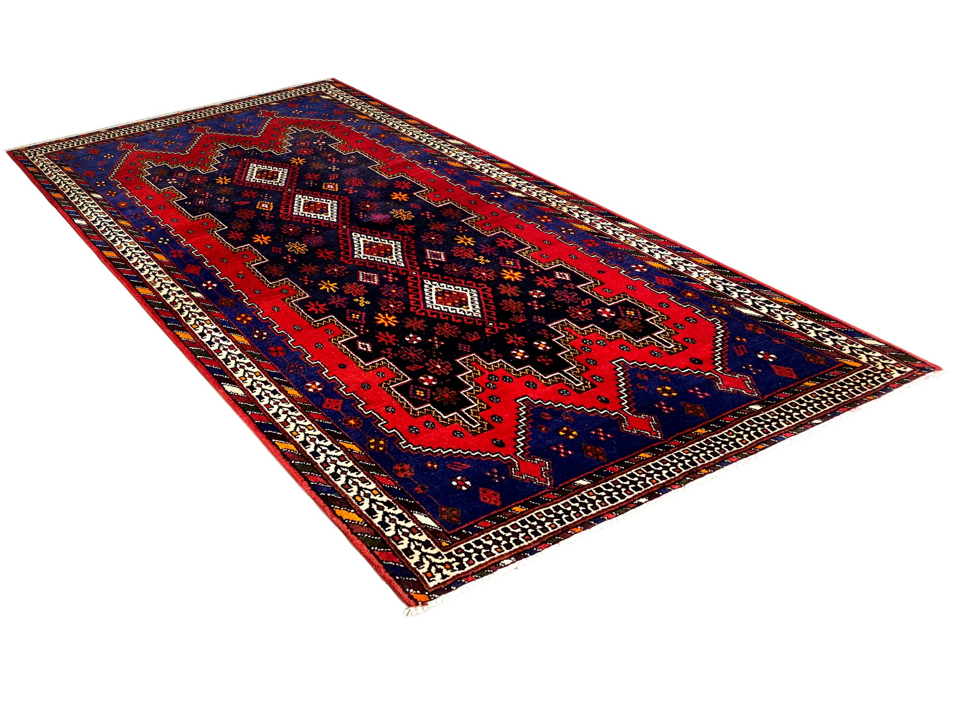 Deze met de hand geknoopte Sirjan loper uit de regio Sirjan in het zuidelijke Perzië (Iran), gemaakt van hoogwaardige, met de hand gesponnen wol, presenteert een karakteristiek en traditioneel ontwerp in diepe donkerblauwe en roodtinten, geaccentueerd door lichte details. Met zijn afmetingen van 208x107 cm is hij ideaal om gangen, entreeruimtes of smalle ruimtes stijlvol te accentueren. Het opvallende geometrische patroon met herhalende ruitmotieven en gestileerde bloemmotieven in de borden weerspiegelt de traditionele knoopkunst van de Sirjan-regio. Het gebruik van met de hand gesponnen wol geeft dit tapijt een bijzondere textuur en duurzaamheid. Deze Sirjan loper harmonieert prachtig met rustieke, traditionele en etnisch geïnspireerde interieurstijlen en geeft elke ruimte een warme, authentieke en karaktervolle sfeer. Dit tapijt is niet alleen een vloerbedekking, maar een venster naar de rijke traditie van Perzische tapijtkunst en een uitdrukking van stijl en individualiteit.