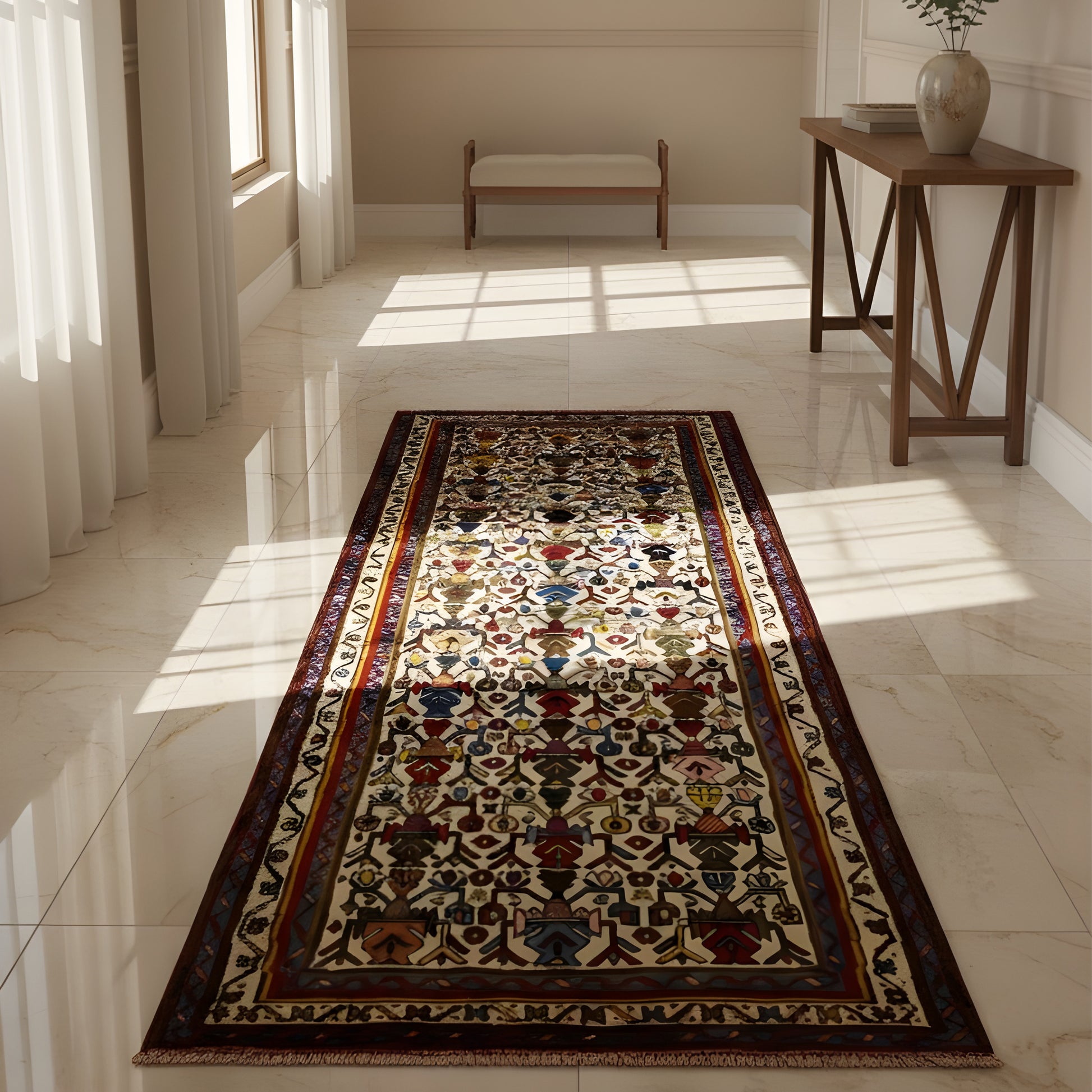 Dieser handgeknüpfte Sirjan Läufer aus handgesponnener Wolle (225x92 cm) verbindet traditionelle persische Kunst mit moderner Wohnästhetik und eignet sich ideal für Wohn- und Flurbereiche im Boho- und Vintage-Décor; das dichte Knotenmuster von 160.000 Knoten/qm und das helle beige Grundfeld mit farbintensiven geometrischen Motiven verleihen jedem Raum Struktur, Wärme und Langlebigkeit, während das fein ausgearbeitete Muster den Teppich zu einem stilvollen Akzent für anspruchsvolle Interieurs macht.