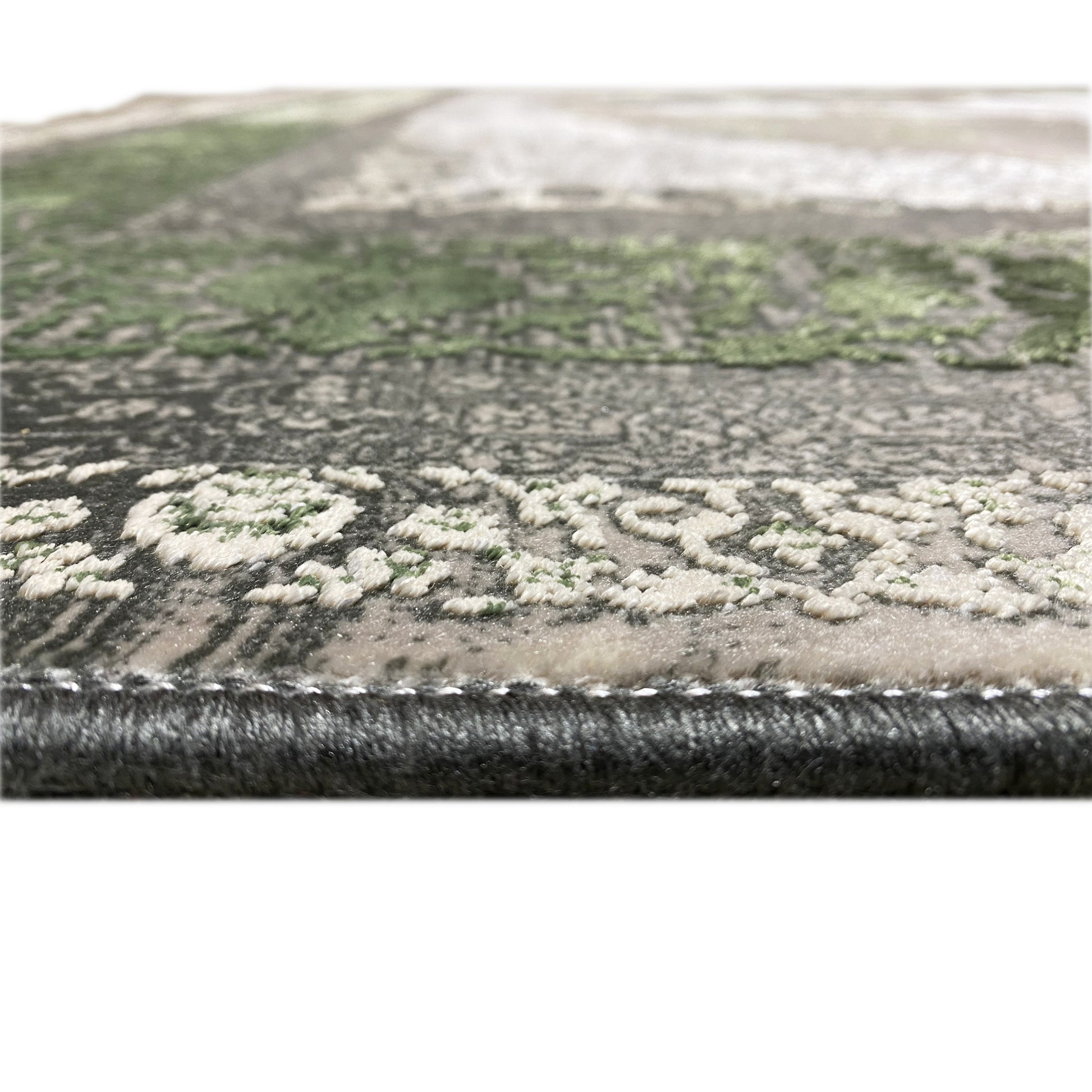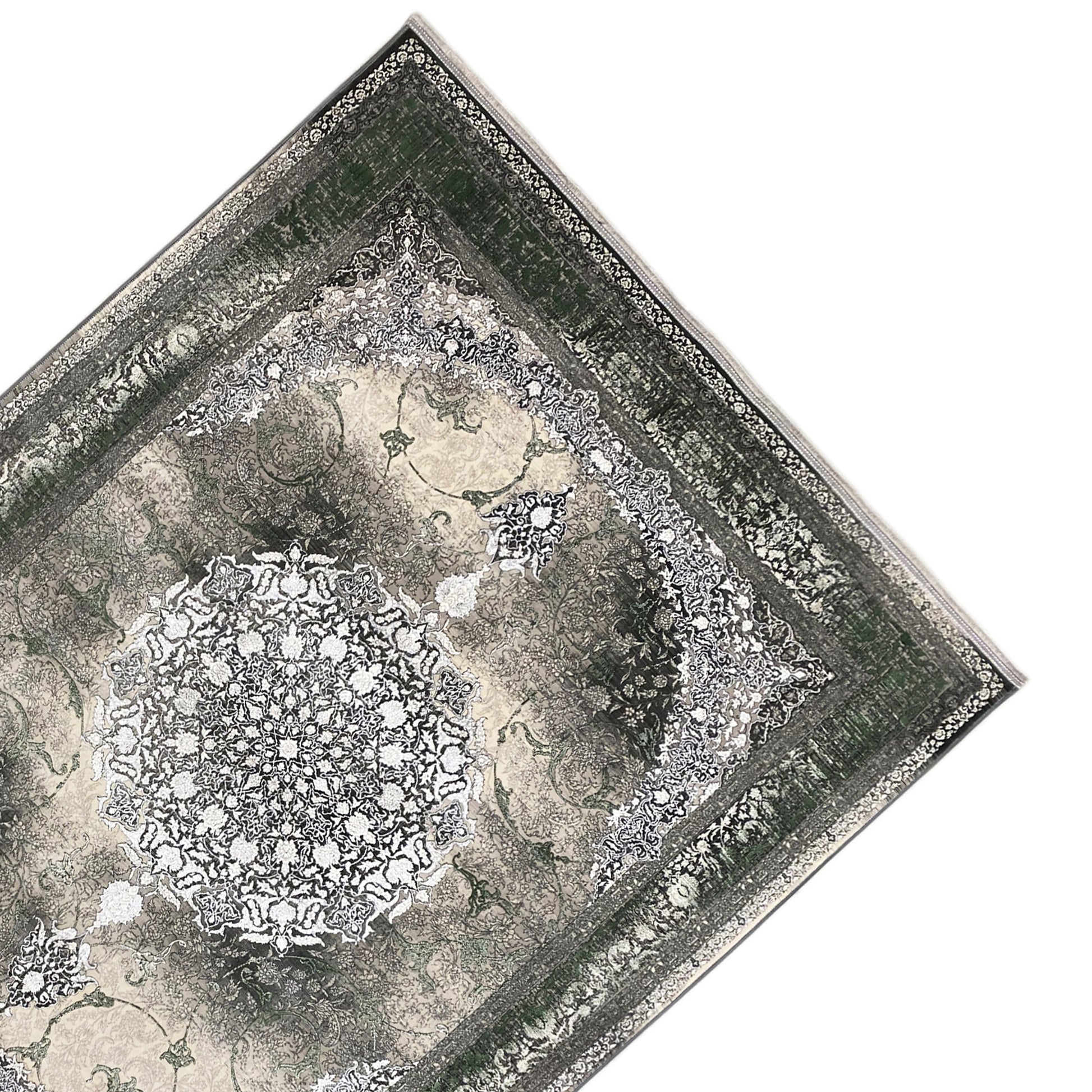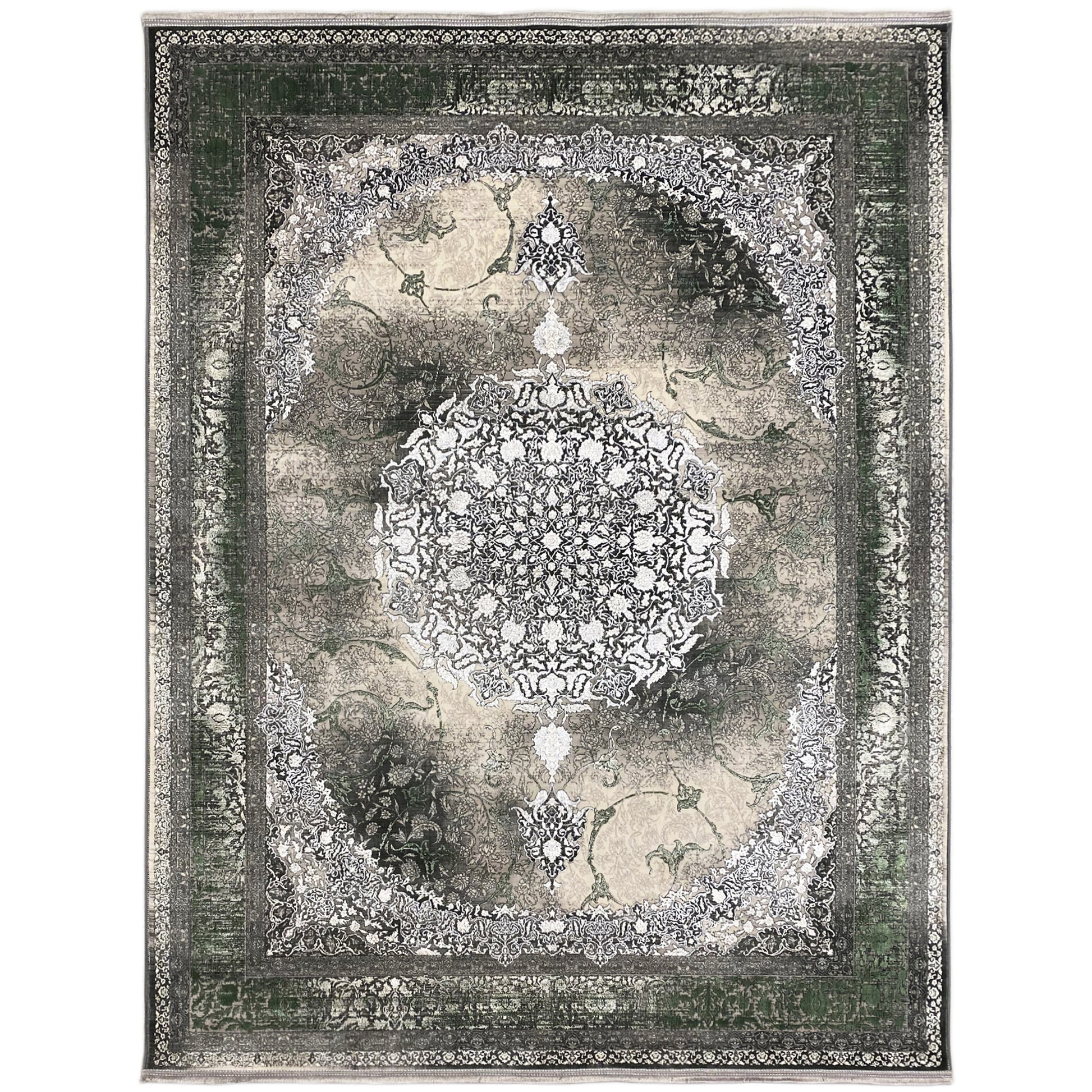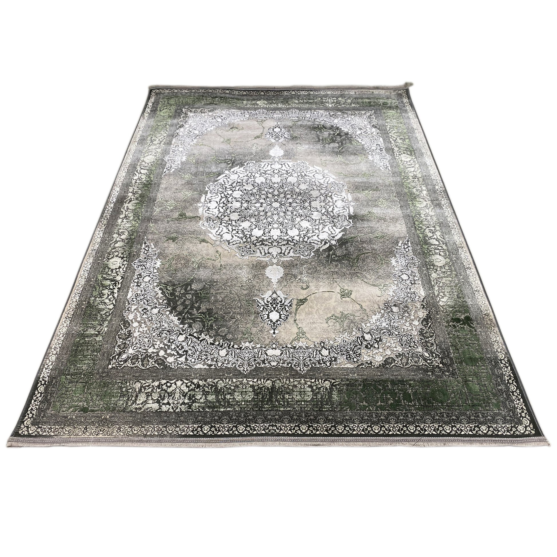 Geef uw huis een vleugje luxueuze elegantie met dit prachtige klassieke tapijt. Het kunstzinnige centrale medaillon in lichtgrijs en crèmekleuren steekt af tegen een rokerige, subtiel vervaagde achtergrond, omlijst door een rijke groene rand. Gemaakt van 100% hittebehandeld acryl, is dit zachte en duurzame tapijt perfect voor drukbezochte ruimtes, omdat het luxe stijl combineert met moderne veerkracht. De royale afmeting van 170x240cm is ideaal om uw woon- of slaapkamer een elegante blikvanger te geven.