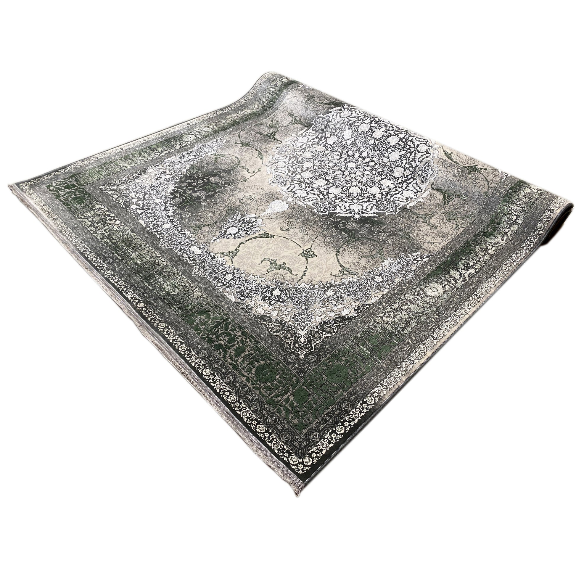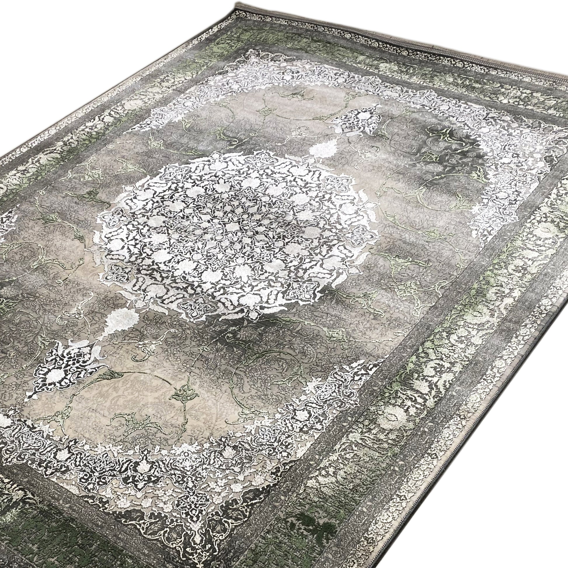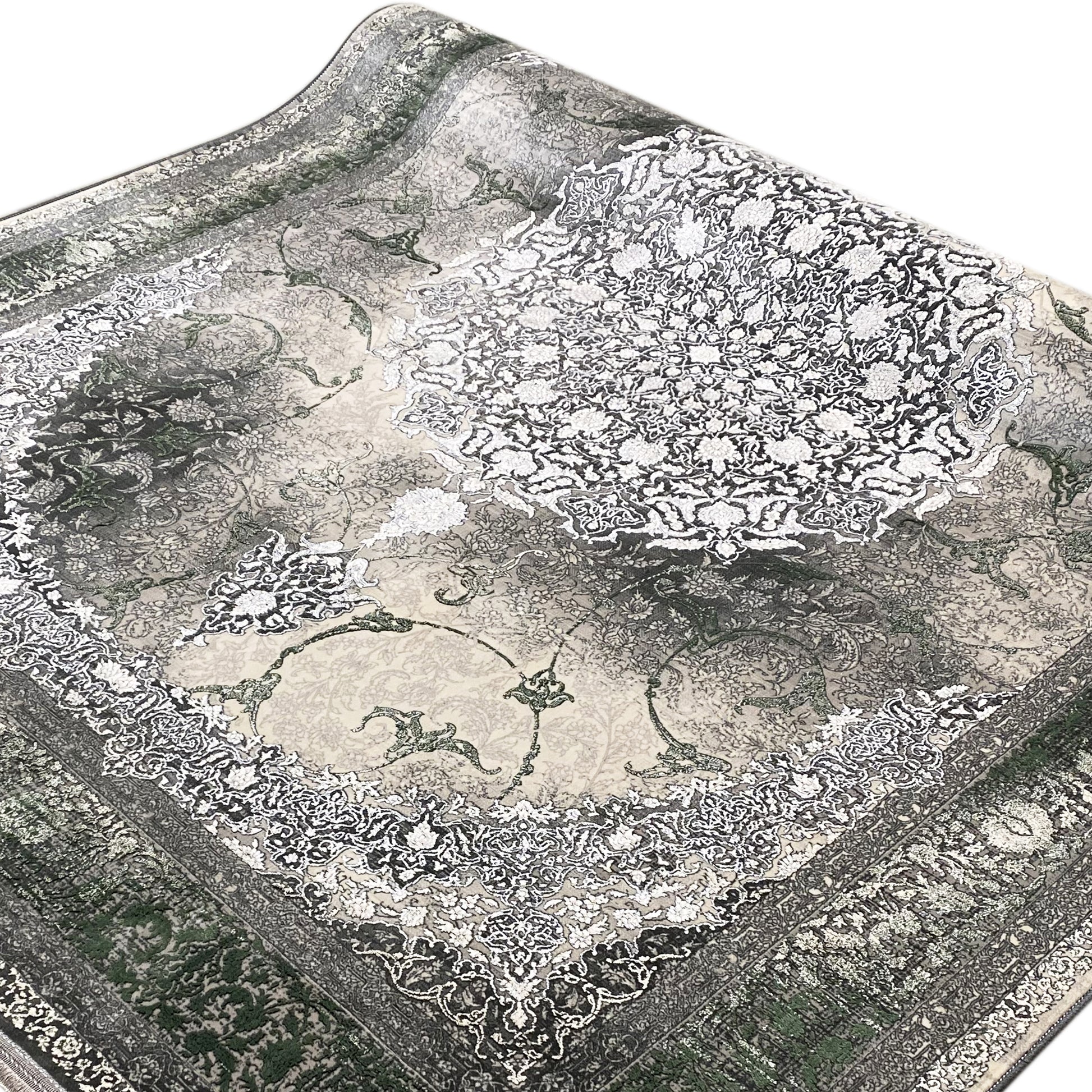 Geef uw huis een vleugje luxueuze elegantie met dit prachtige klassieke tapijt. Het kunstzinnige centrale medaillon in lichtgrijs en crèmekleuren steekt af tegen een rokerige, subtiel vervaagde achtergrond, omlijst door een rijke groene rand. Gemaakt van 100% hittebehandeld acryl, is dit zachte en duurzame tapijt perfect voor drukbezochte ruimtes, omdat het luxe stijl combineert met moderne veerkracht. De royale afmeting van 170x240cm is ideaal om uw woon- of slaapkamer een elegante blikvanger te geven.