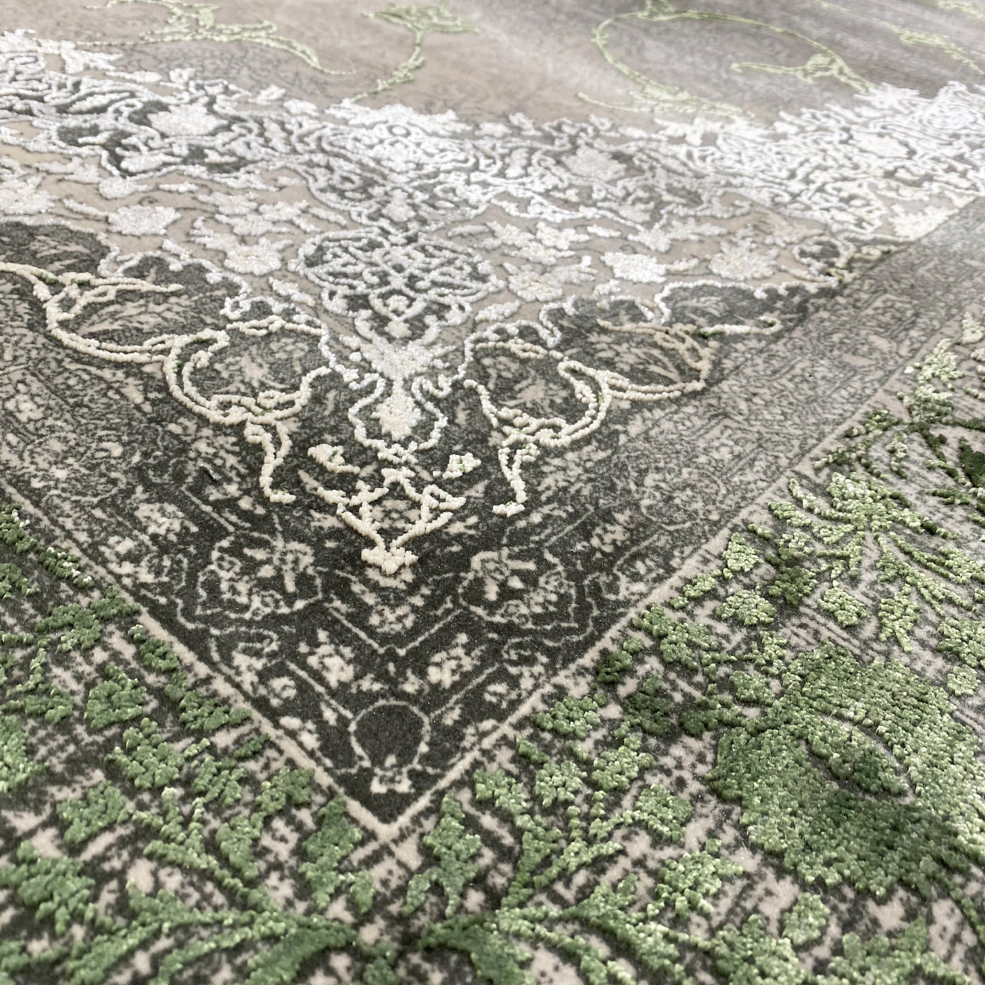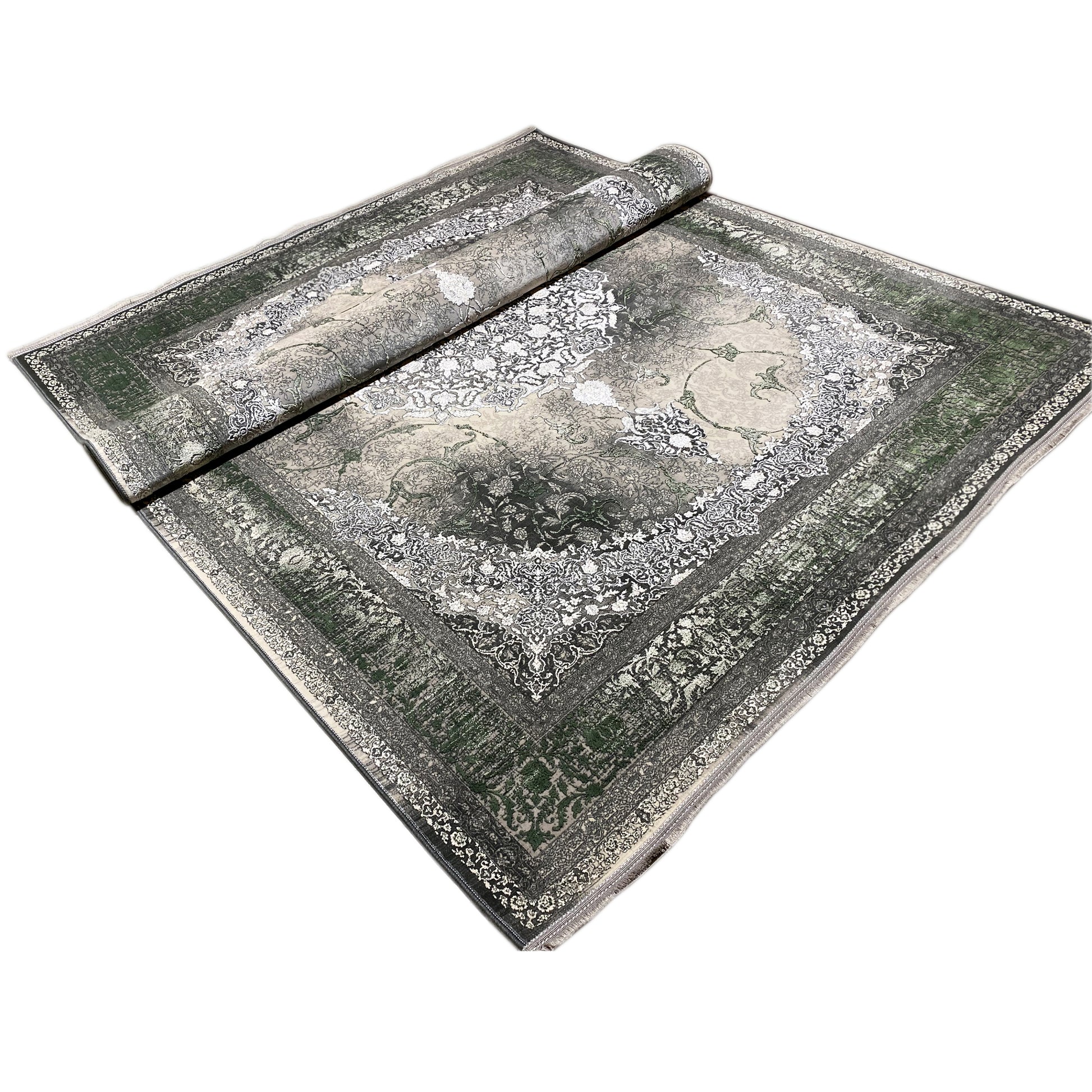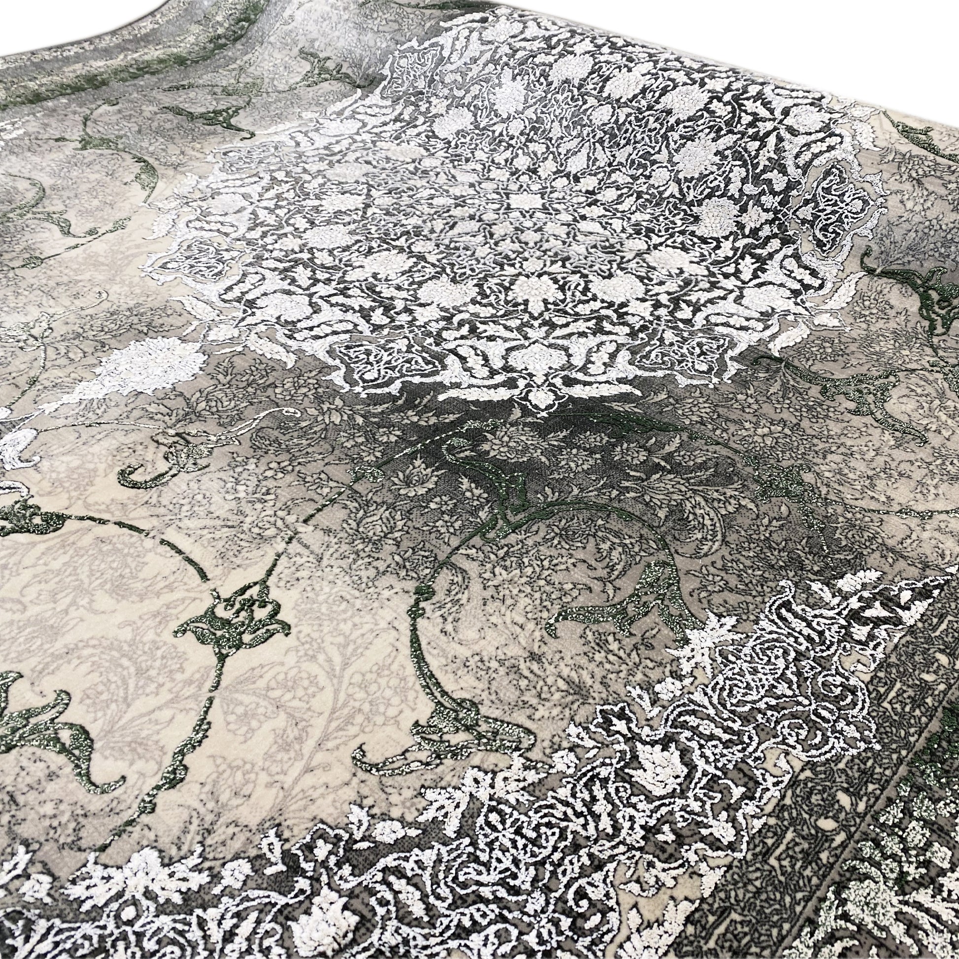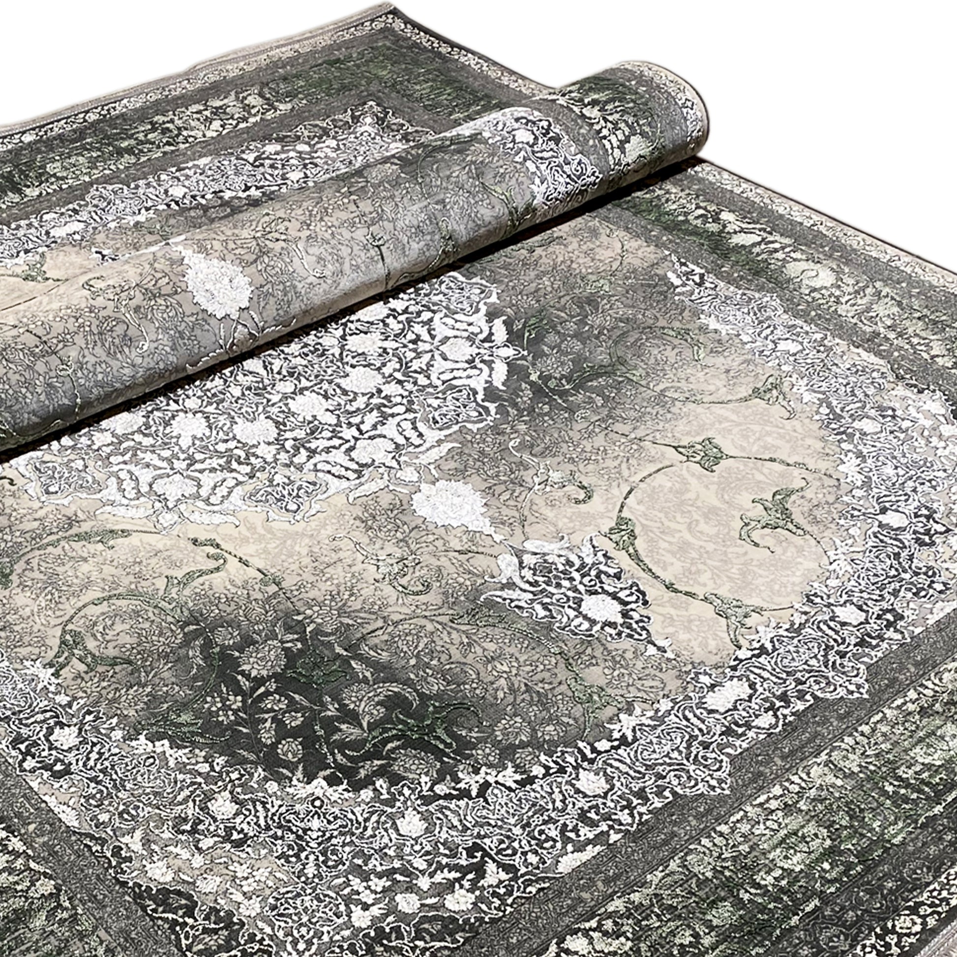Geef uw huis een vleugje luxueuze elegantie met dit prachtige klassieke tapijt. Het kunstzinnige centrale medaillon in lichtgrijs en crèmekleuren steekt af tegen een rokerige, subtiel vervaagde achtergrond, omlijst door een rijke groene rand. Gemaakt van 100% hittebehandeld acryl, is dit zachte en duurzame tapijt perfect voor drukbezochte ruimtes, omdat het luxe stijl combineert met moderne veerkracht. De royale afmeting van 170x240cm is ideaal om uw woon- of slaapkamer een elegante blikvanger te geven.